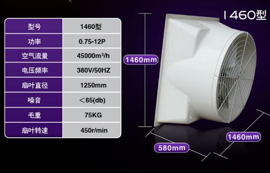 外框尺寸:1460*1460*850mm 风叶尺寸:1220mm 风叶材质:玻璃钢材质 功率:750W 电压:220V/380 传动方式:直连式 百叶: PVC 噪音:50-65db 风量:45000 m3/h 重量:75KG
